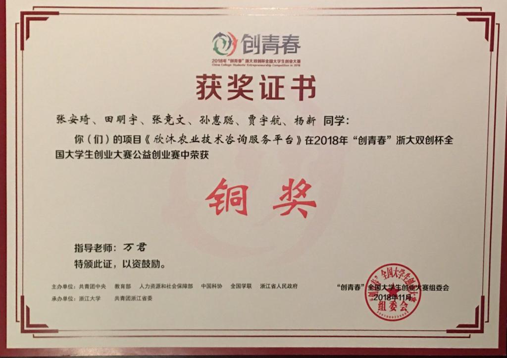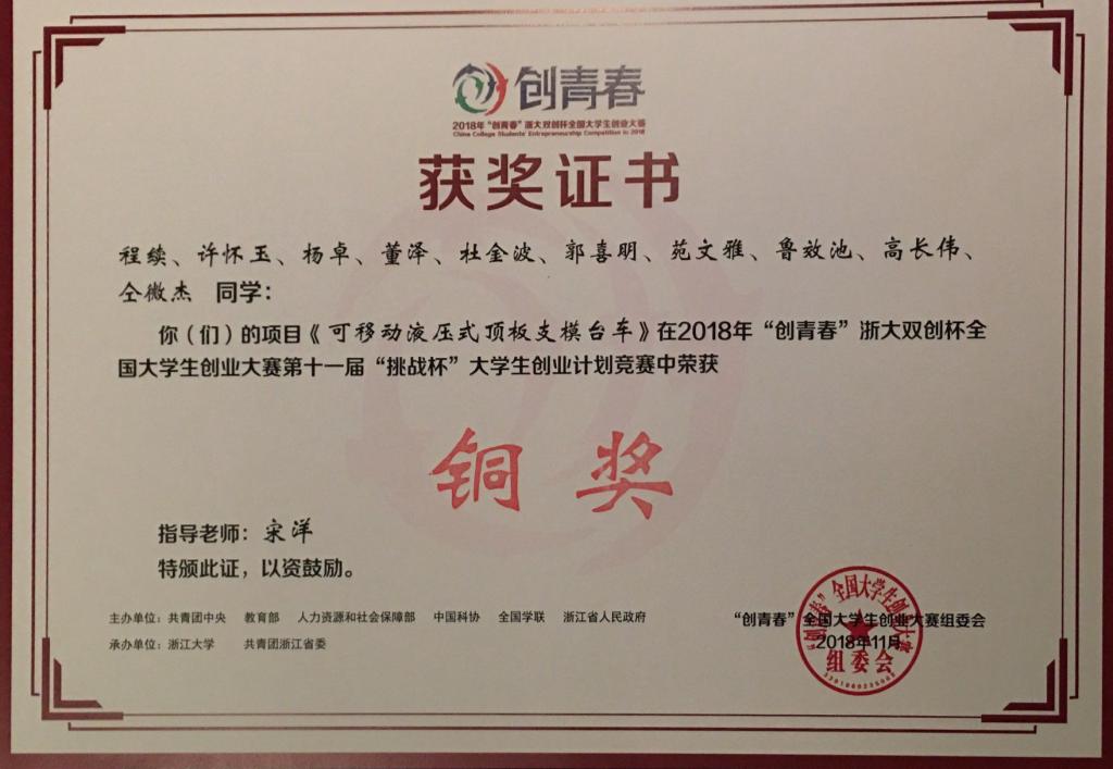 本次大赛以“弄潮创青春,建功新时代”为主题,按照校级、省级、全国三级赛事体制,共有全国2200余所高校的学生作品参赛。我校共有两个学生创业项目获得奖项。土木工程学院宋洋老师指导、程续等学生完成的《可移动液压式顶板支模台车》荣获“挑战杯”创业计划竞赛铜奖,营销管理学院万君教授指导、张安琦等学生完成的《欣沐农业技术咨询服务平台》荣获公益创业赛铜奖,这也是我校学生首次在全国公益创业类别赛中获奖。