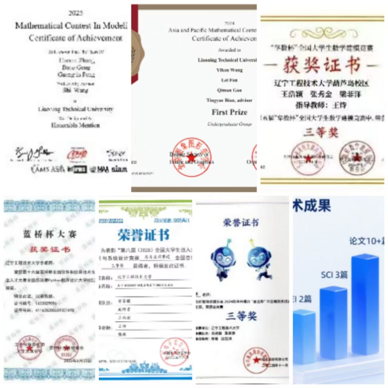 在数学建模领域,2025年美国大学生数学建模竞赛获H奖2项,2024年全国大学生数学建模竞赛获辽宁省一等奖2项、省二等奖1项、省三等奖1项,第五届“华数杯”全国大学生数学建模竞赛获国家二等奖1项、国家三等奖1项,2024年第十四届APMCM亚太地区大学生数学建模竞赛国家级一等奖2项、国家二等奖1项、国家三等奖1项。