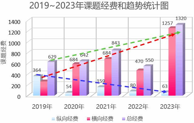 2019-2023年期间,共获批纵向、横向项目88项,经费总额度3984万元。其中纵向项目获批总数为44项、获批经费为720万元,横向项目获批总数为44项、获批经费为3264万元。在纵向项目中,91直播