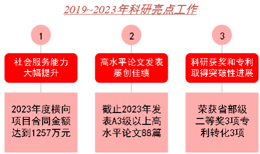 2019-2023年期间,在成果获奖方面取得较大进展,获省政府、协会类奖项9项,其中二等奖3项。出版著作6部,其中英文专著1部。在学术交流方面,积极鼓励教师参加国内外学术交流活动,近5年教师国内、国际会议参会数量达117次,做学术报告19次。同时,学院积极邀请国内外知名高校学者、企业优秀工程师、优秀校友来院举办学术讲座,近5年共举办各类学术论坛讲座30余次。