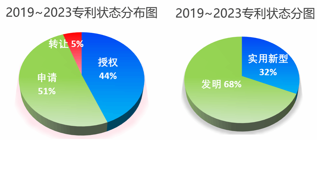 2019-2023年期间,共申请专利57项,授权29项,授权比例近50%,发明专利占比68%,反映出申请专利的新颖性、创造性和实用性大幅提高。特别是在成果转化方面取得突破,实现专利转化3项,反映出科研成果正在由理论探讨向实际应用转变。除了专利以外,91直播