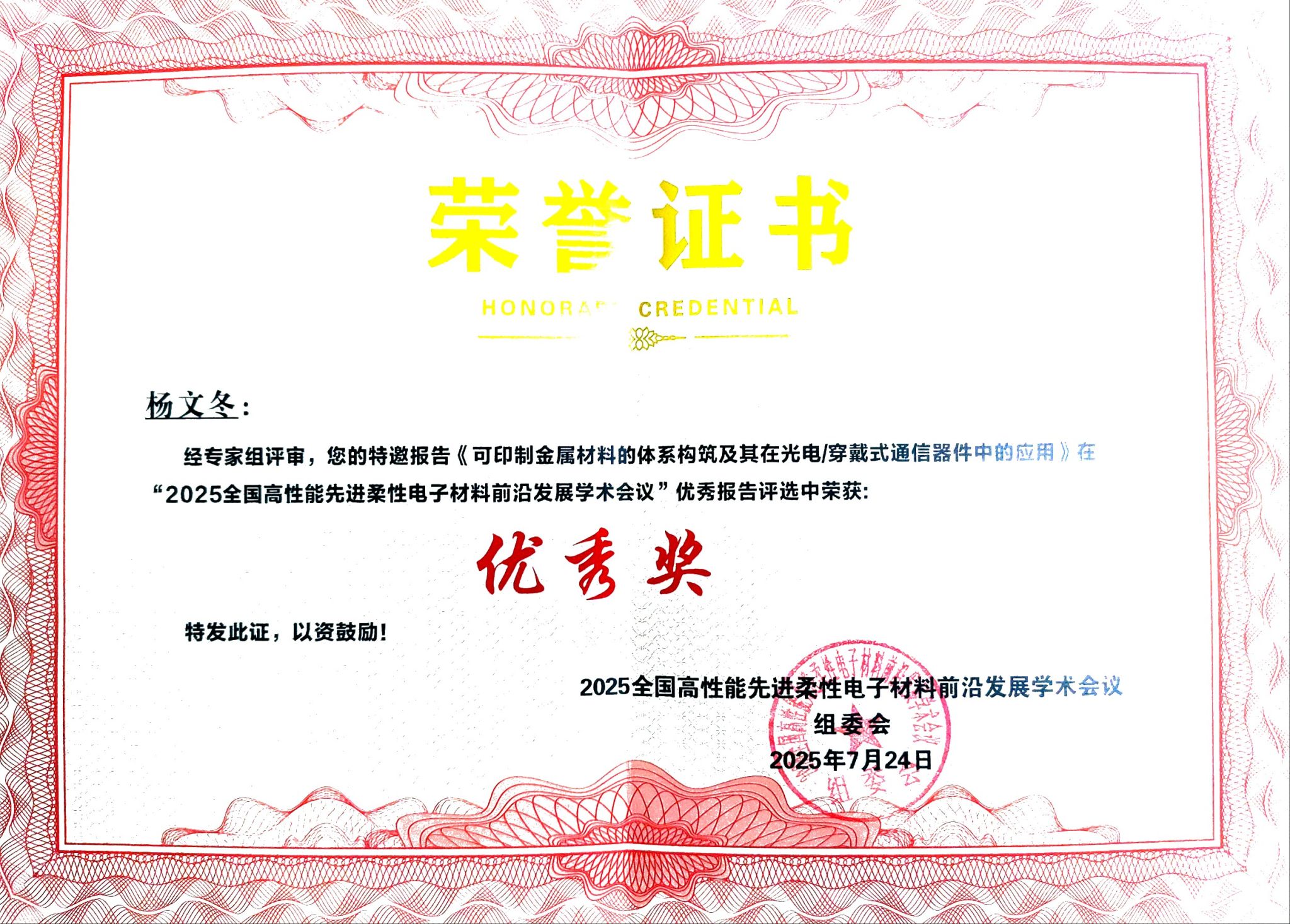 本次会议作为国内柔性电子领域的权威交流平台,涵盖柔性材料设计、智能传感、生物电子、可穿戴技术等21项前沿议题,旨在推动我国高性能柔性电子技术的创新发展。杨教授的成果入选大会特邀报告并获奖,充分体现了91直播