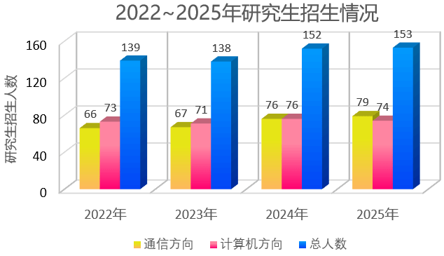 2025年硕士研究生招生复试工作顺利完成。本次共录取硕士研究生153人(含"退役大学生士兵"专项计划1人),其中通信方向79人、计算机方向74人,招生计划完成率达100%。
