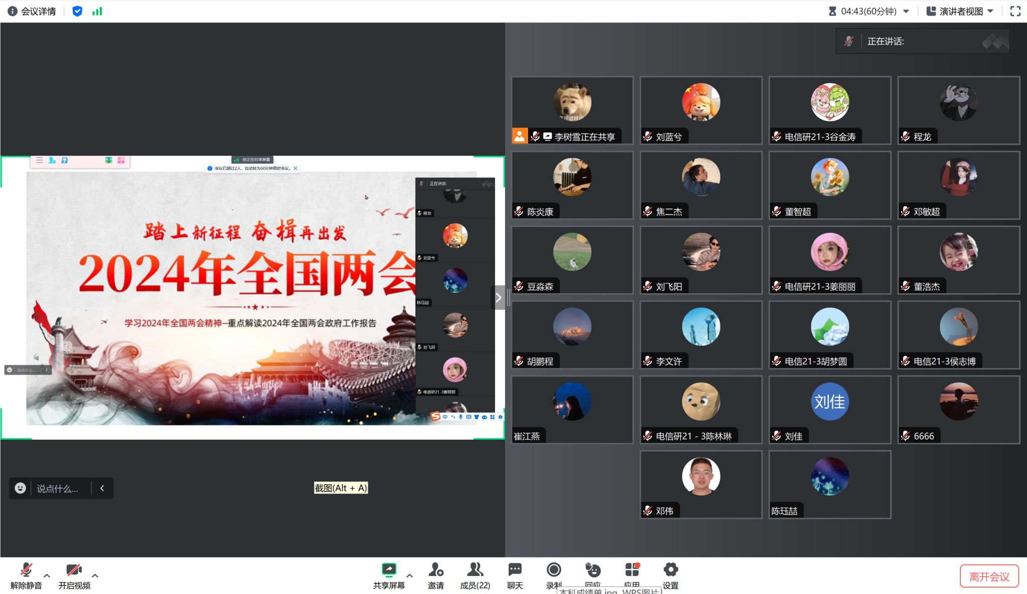 2024年3月11日全国两会在京顺利闭幕,为了学习贯彻两会精神,让广大研究生统一思想、凝聚共识、鼓舞干劲,91直播 于3月20日组织在校研究生开展宣讲两会精神主题讲座和班会。