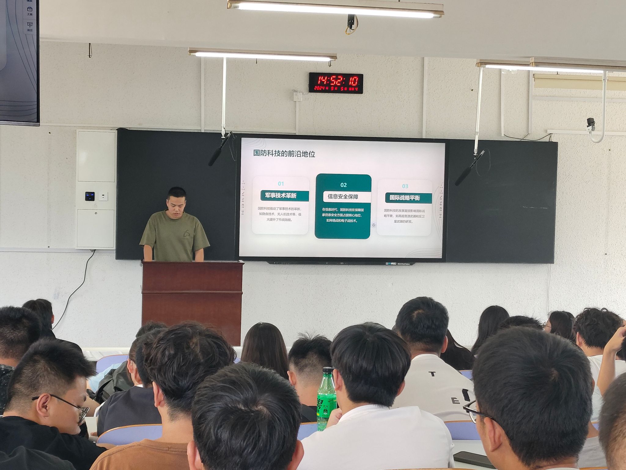 本次活动还邀请到了退伍大学生、研究生新生代表高煜涵同学上台分享了他的军旅经历。高煜涵同学以饱满的热情和生动的语言,向大家介绍了在军队中的生活体验以及如何将专业知识应用于强军梦的实践中。他深情讲述了军队生活中的挑战与收获,并结合自身在军队中的经历,阐述了科技如何在现代军事中发挥重要作用。高煜涵同学的讲述不仅让新生们感受到军人的风采,也激发了大家对科技强国梦的信心和热情。