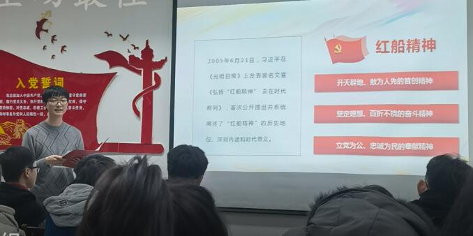 他理想信念坚定,拥护党的纲领,遵守党的章程,牢记“四个意识”、坚定“四个自信”、做到“两个维护”,以习近平新时代中国特色社会主义思想武装头脑,坚定不移跟党走中国特色社会主义道路。小小红船,承载千均,在党校的培训中,他自告奋勇进行关于红船精神的红色宣讲,跟大家一起重温那段峥嵘岁月,沿着早期共产党人的足迹,去探寻我们党永不褪色的精神丰碑。