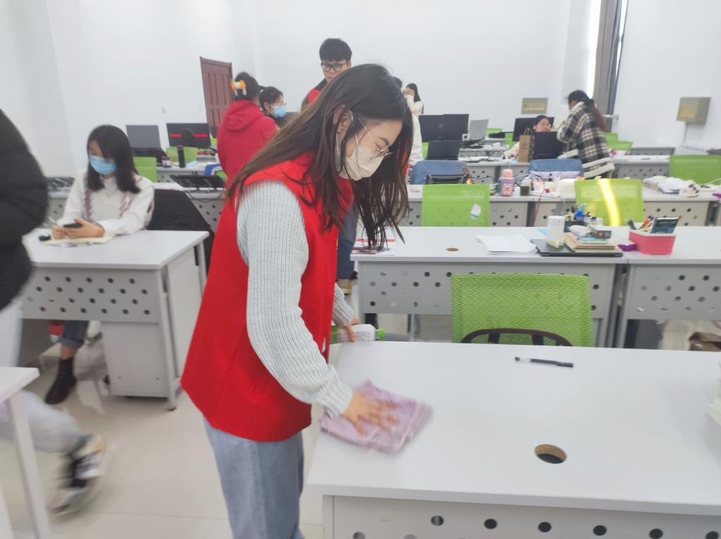 研究生党员在各支部书记的带领下对实验室进行了大扫除。由于寒假期间实验室没有使用,桌椅和讲台都落了很多灰尘,在角落和地板上也可见一些零碎的纸屑,为了保证新学期研究生学习活动的开展,实验室卫生急需彻底清洁。研究生党员在接到工作任务后,立即为清扫工作准备工具。为提高打扫效率,他们分成几组,分别负责擦拭桌椅和讲台、扫地以及拖地等。简单的工作并没有减少大家的热情,大家互相帮助,条理有序地完成了所有工作。在确保各处都收拾整洁、打扫干净后,同学们认真清洗了卫生工具。这次活动提升了研究生党员的服务意识,使研究生党员对雷锋精神有了更深的理解和感受。
