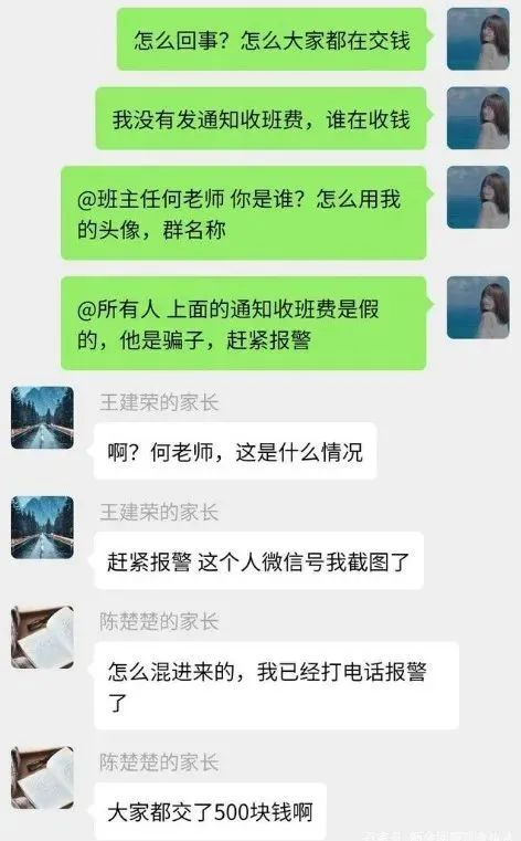 这时,同学们才发现,班级群里竟然有两位头像和名称一模一样的“老师”,而带头交费的“同学”也从未见过。