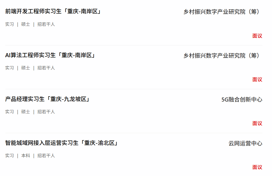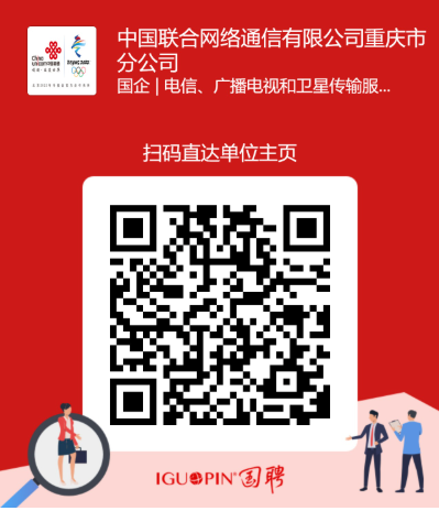 中国联合网络通信有限公司重庆市分公司(以下简称“重庆联通”),是中国联通在渝设立的分支机构,在传统通信服务能力基础上已形成了大数据、物联网、云计算等新兴产业发展新格局和云网一体化运营核心竞争力。重庆联通为打造高素质员工队伍,为校招新员工量身 定制了“365培养体系”,以集中面授、项目实践、导师制、座谈等方式,组织为期一年的“入职培训”、“孵化培训”、“提升培训”和“关爱培训”,并根据新员工的专业和岗位,实施“新苗计划”、“IT人才计划”和“管培生计划”,为新员工拓宽职业发展通道。重庆联通诚挚邀请您加盟联通大家庭,共同迎接通信行业移动互联的美好明天!
