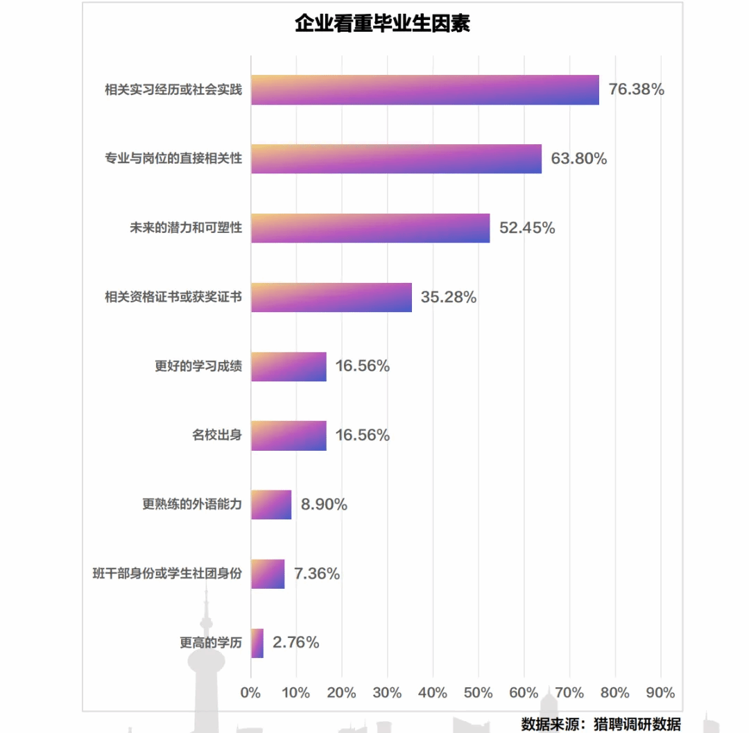 相比于其他的因素,企业最看重的还是毕业生的实习经历。