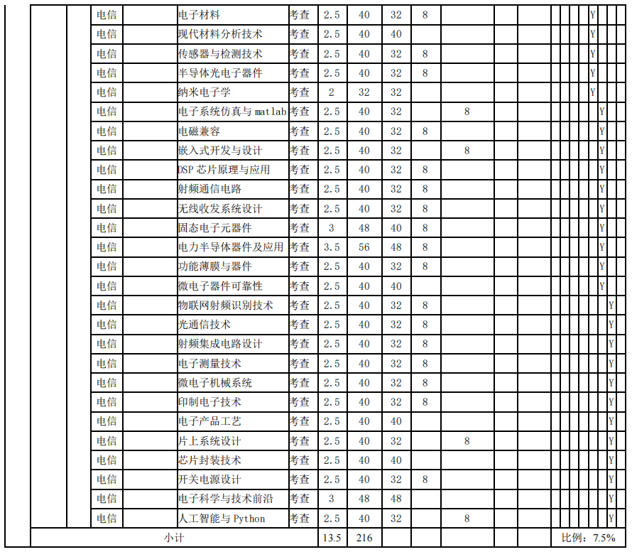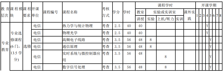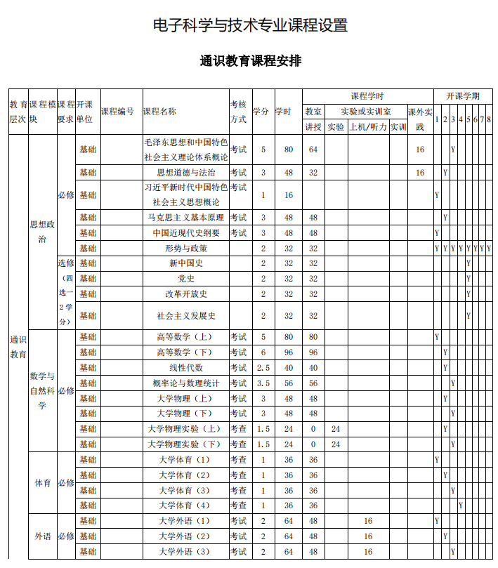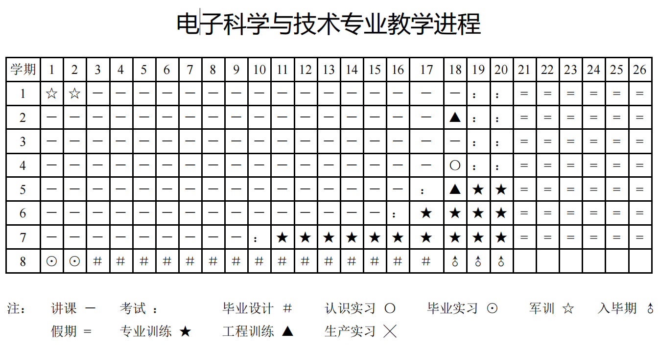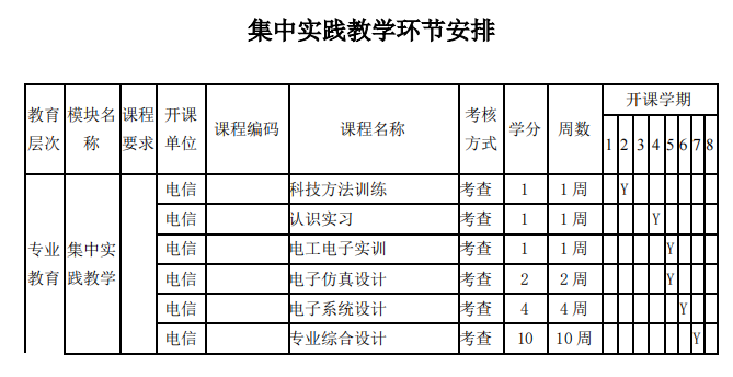 科技方法训练、电工电子实训、认识实习、电子仿真设计、电子系统设计、专业综合设计、毕业实习、毕业设计。