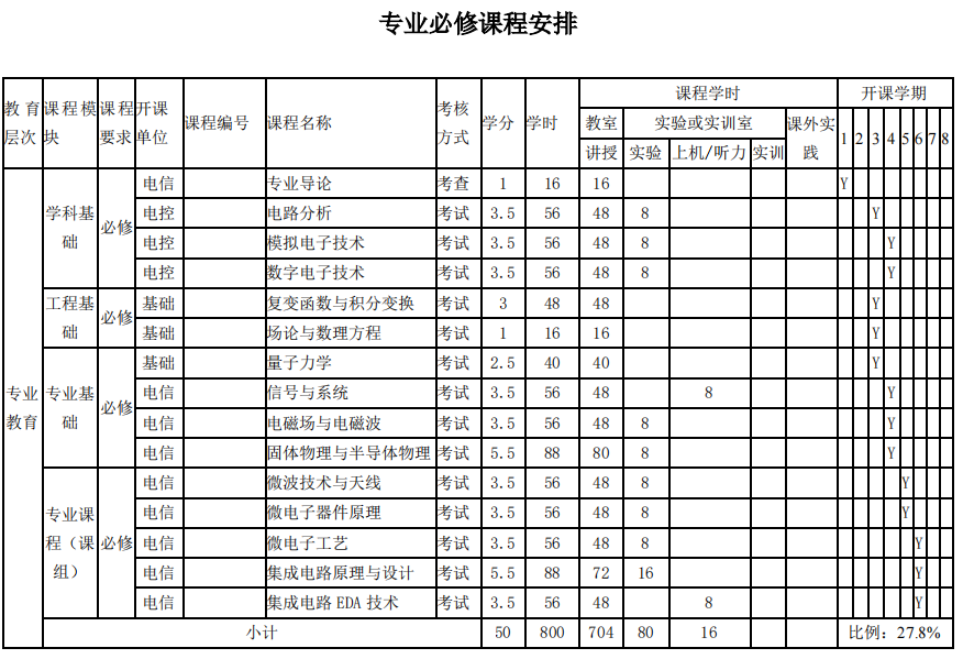 量子力学、固体物理与半导体物理、电磁场与电磁波、微电子器件原理、微电子工艺、集成电路原理与设计、集成电路EDA技术、信号与系统、微波技术与天线。