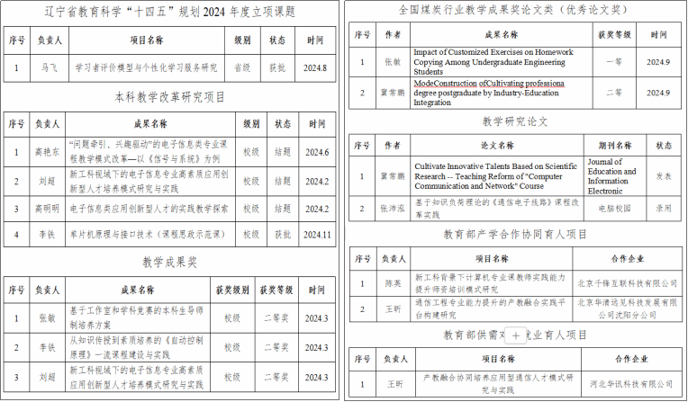 通过多措并举及强化教学管理体系建设,学院本年度获批辽宁省“智慧城市无线大数据现代产业学院”,获批辽宁省教育科学“十四五”规划2024年度立项课题1项,获批教育部产学研协同育人项目2项、教育部供需对接就业育人项目1项,获评校级课程思政示范课1门。同时,教学成果获2024年全国煤炭行业教学成果奖论文类(优秀论文奖)一、二等奖各1项,获校教学成果二等奖3项,校级教改项目结题验收3项,发表和录用教学研究论文2篇。
